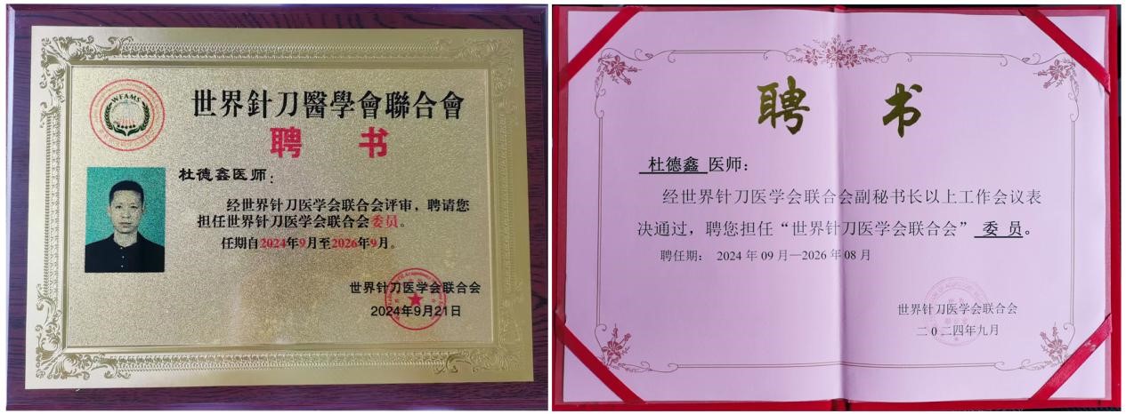 杜德鑫主任身为针刀镜临床应用资格专家,始终不遗余力地担当着针刀文化的传播者以及针刀治疗的推动者。他长期坚守在临床一线,以其过硬的针刀技术、扎实的理论功底以及具有前瞻性的理论研究,在针刀医学界赢得了颇高的声誉。鉴于杜德鑫主任在国际针刀领域所做出的突出贡献,经世界针刀医学会联合会严谨会议表决通过,他荣获了 “2024 年度杰出针刀医师奖” 这一殊荣,同时还光荣当选为世界针刀医学会联合会委员。