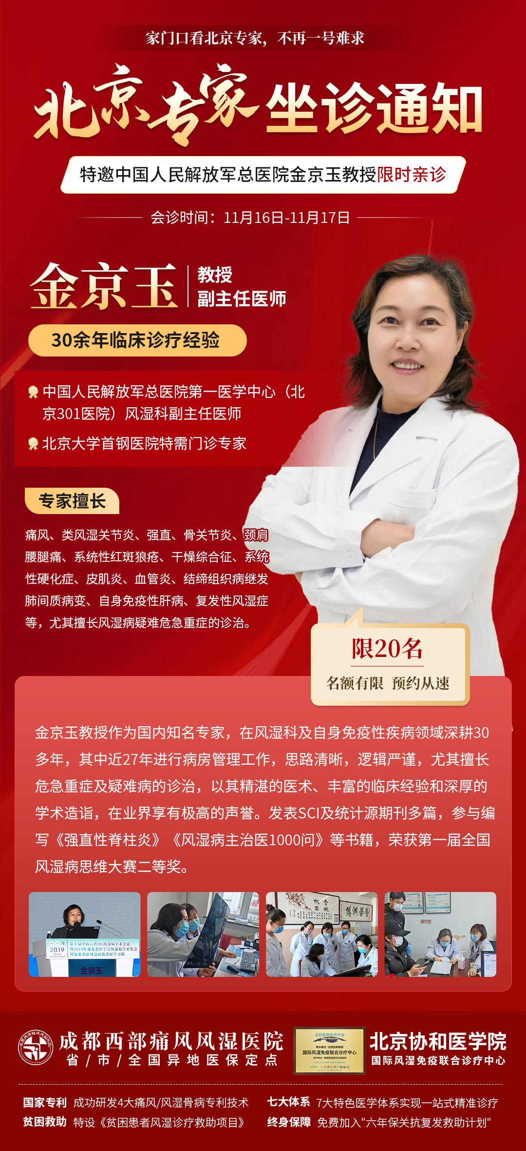 届时,成都西部痛风风湿医院王健院长将率领多学科专家团携手中国人民解放军总医院(北京301医院)金京玉教授,于11月16日—17日期间联合会诊,评估药物治疗效果及副作用风险,帮助患者缩短用药周期、避免药物依赖,共同为患者制定个性化的最佳诊疗方案。同时进行多项诊疗公益援助,减轻患者就医负担!
